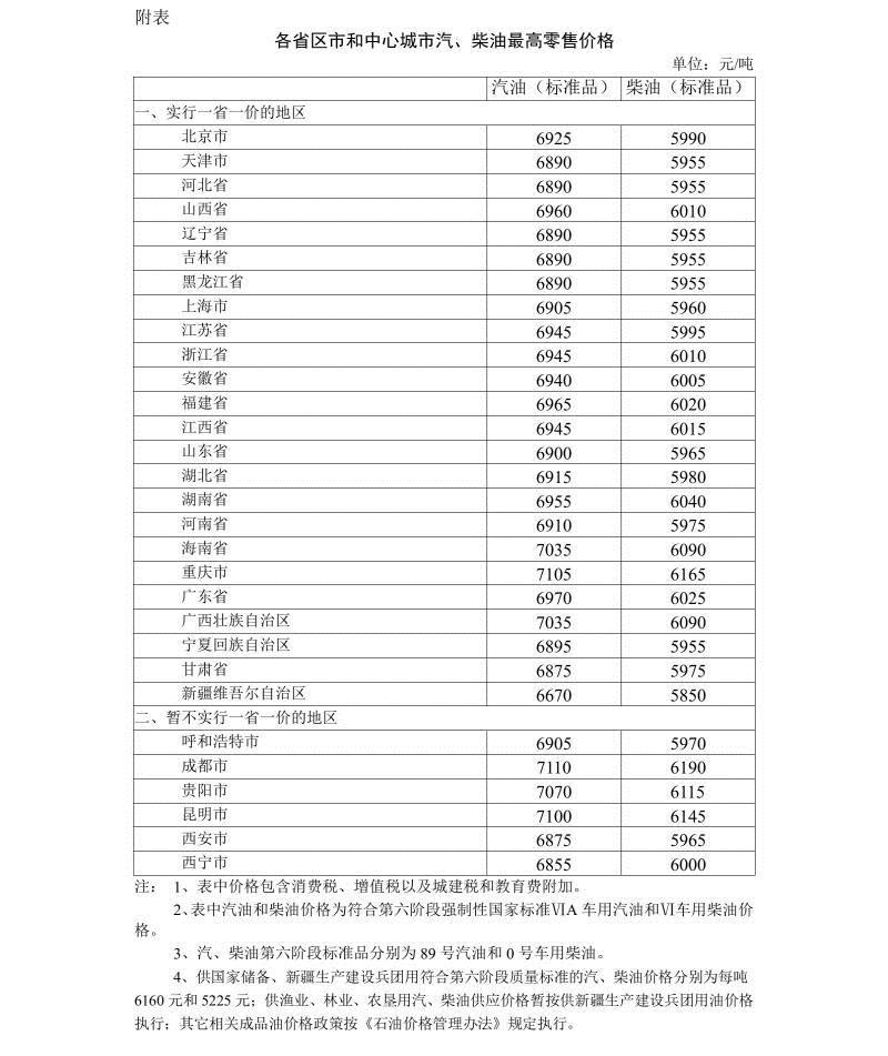 调整后,各省(区、市)和中心城市汽、柴油最高零售价格见附表: