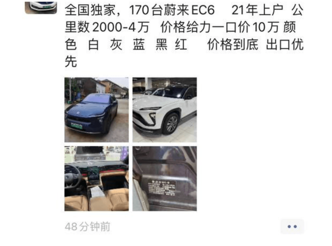 近日,有汽车博主爆料,有经销商正在销售二手蔚来EC6,数量为170台,售价为一口价10万元。其介绍道,这批蔚来EC6在2021年上户,公里数在2千到4万之间,配色选择比较齐全,白/灰/蓝/黑/红等颜色都有。同时,其表示价格已经是底线,优先出口。