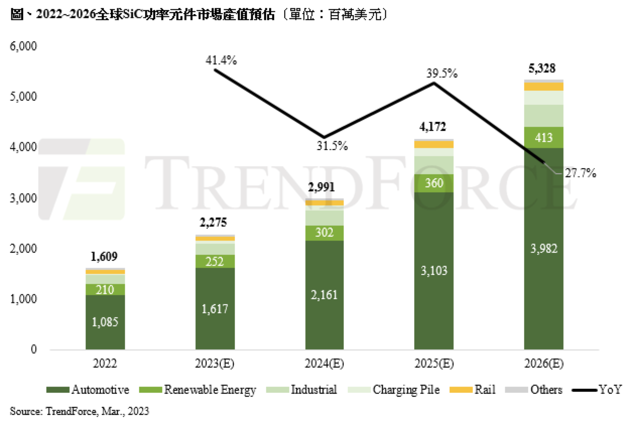 从市场来看,SiC功率器件的前两大应用包括电动汽车和再生能源领域,2022年规模分别达到了10.9亿美元、2.1亿美元,占整体SiC功率器件市场产值约67.4%和13.1%。预计到2025年,车用SiC市场规模将增至39.82亿美元 。