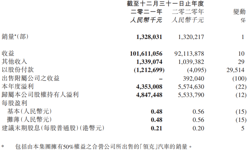 聚焦其收益来源,仍主要以销售汽车及相关服务为主,2021年期间共计收入876.97亿元,占公司总营收的86.32%,较去年同期微增4.63%。而根据吉利汽车官方产销数据显示,2021年吉利汽车销量为1,328,029辆,同比增长1%。