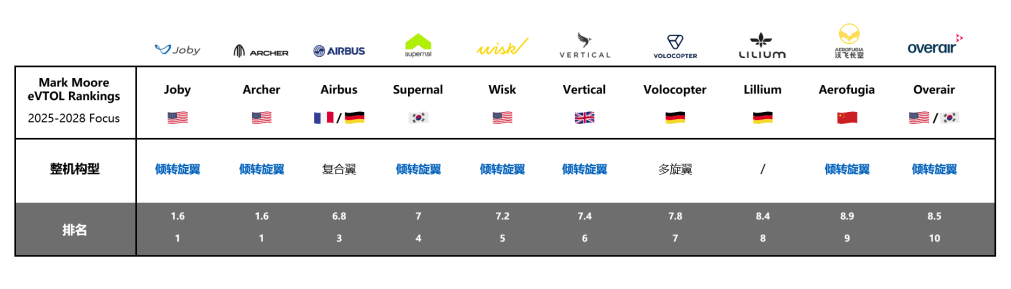 进一步细分,当前载人eVTOL领域主要有三种技术路线:多旋翼、复合翼、倾转旋翼,三者研发难度依次递增,其中倾转旋翼构型在续航、速度、载重和舒适性优势明显。在今年美国《航空周刊》发布的Mark Moore对于全球从事eVTOL研发的公司排名中,全球排名前10的企业中有7家选择了倾转旋翼构型。沃飞长空是其中唯一的中国企业。
