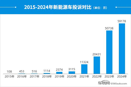 新能源车近10年来的投诉量整体呈现出快速走高的趋势,特别是在2023年出现爆发式增长,直接跨入“5万宗时代”。2024年投诉量再创新高,但同比涨幅有所下降。