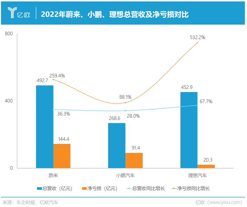 2022年,小鹏收入为268.6亿元,增幅28%,均低于蔚来和理想。