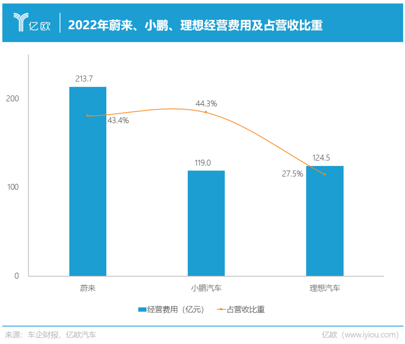 2022年,小鹏研发费用和销售管理费用之和达到119.0亿,占总收入的44.3%,而理想的占比仅为27.5%,蔚来虽然也高达43.4%,但前提是蔚来大幅提升了研发费用至108.4亿。