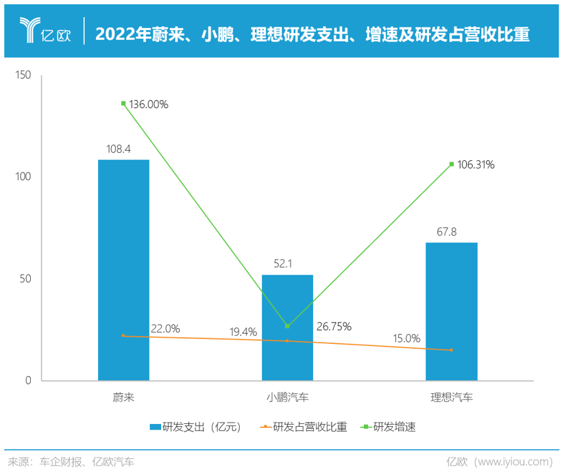 在蔚来和理想研发费用都翻倍的情况下,小鹏研发费用较前一年仅有26.75%的涨幅,曾经最看重自研的小鹏,2022年的自研投入仅有52.1亿,远低于蔚来的108.4亿和理想的67.8亿。