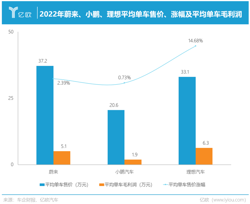 2022年,小鹏平均单车售价为20.6万元,低于蔚来的37.2万、理想的33.1万元。在平均单车售价的涨幅上,小鹏也是仅有0.73%,低于蔚来的2.39%,理想的14.68%。